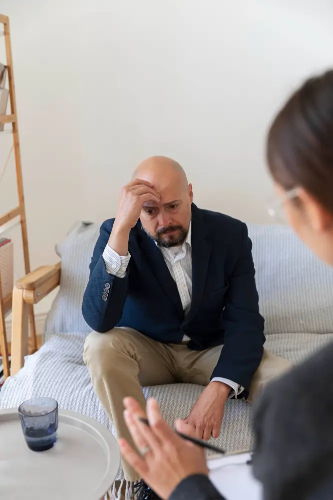 Man in therapy or mental health consultation session; image conveys emotional support and professional guidance.